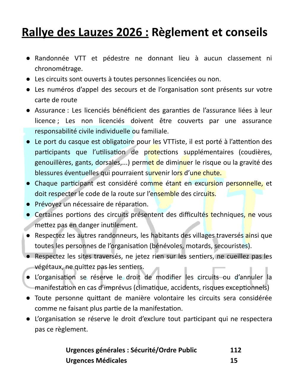 Avant de partir sur les parcours vous devez retirer une carte de participant indiquant les numéros d’appel en cas de difficulté ou d’urgence.