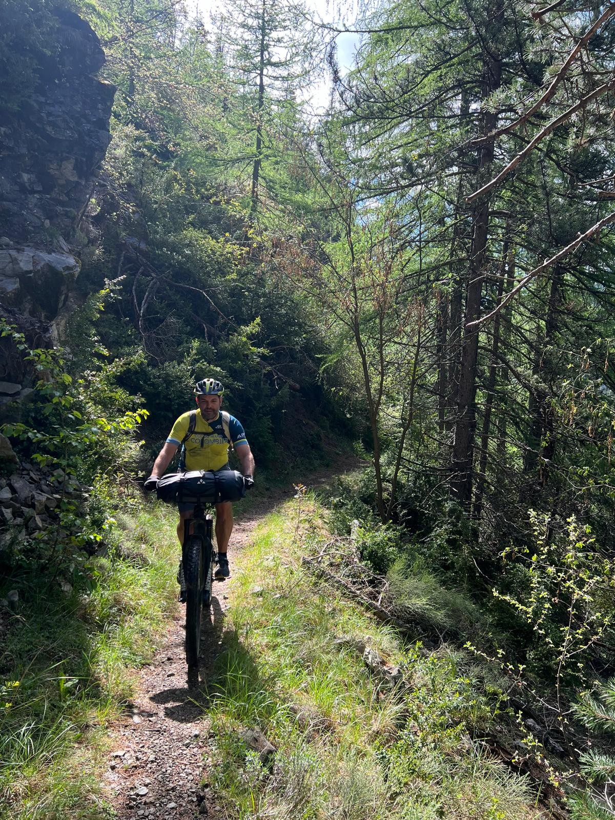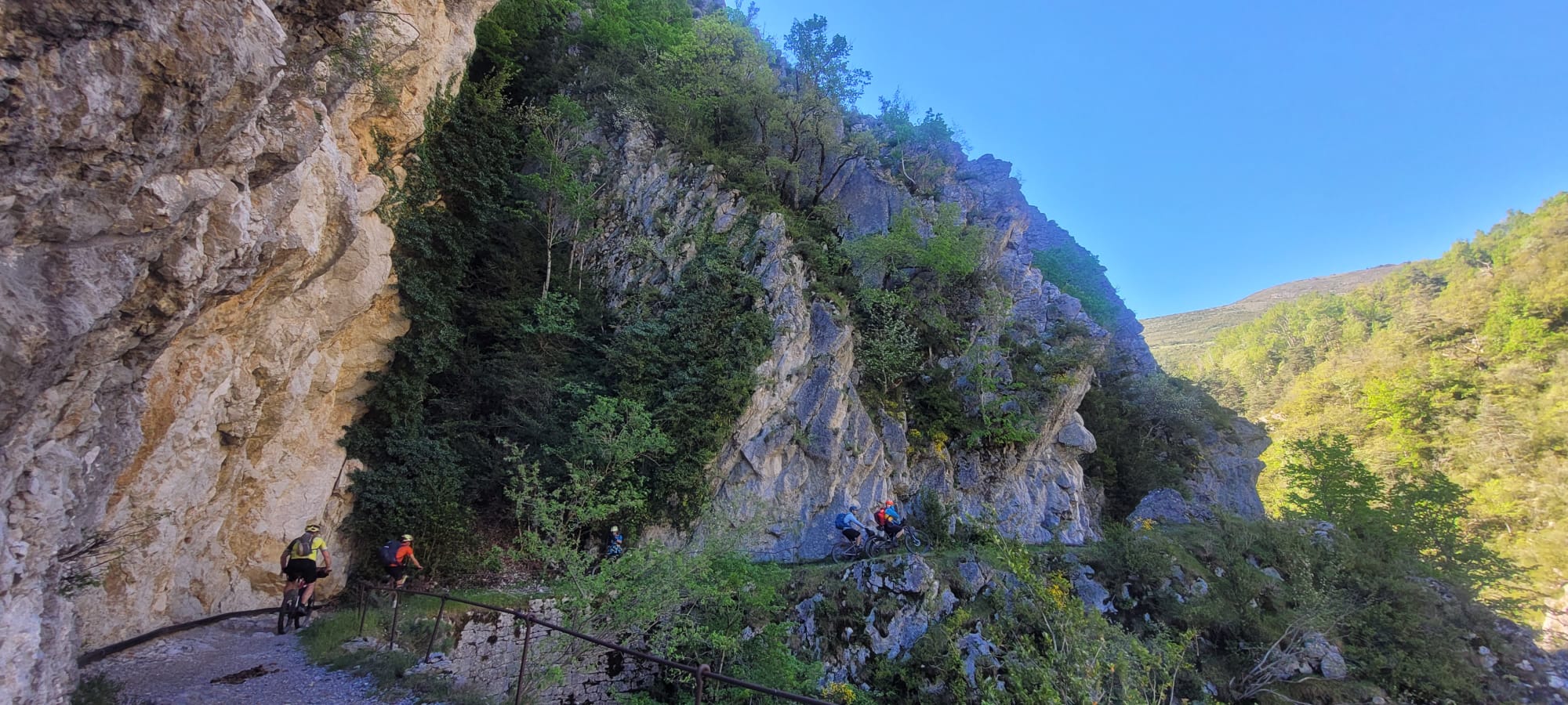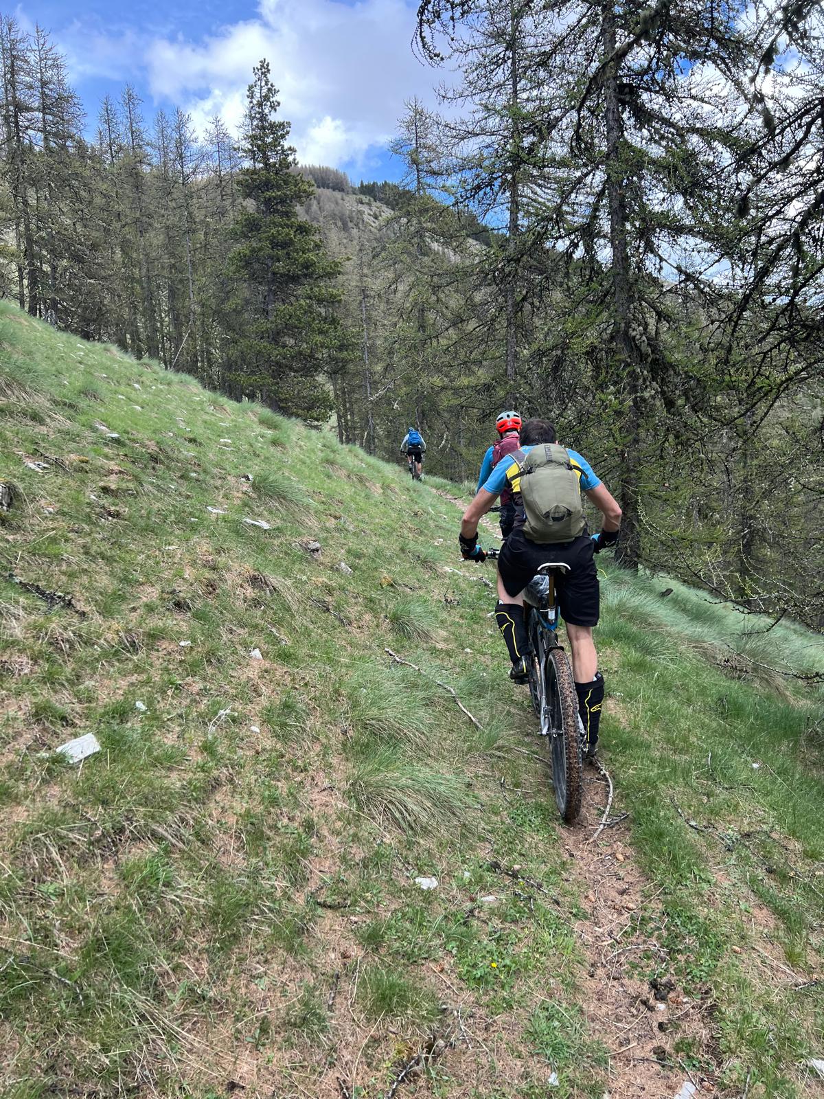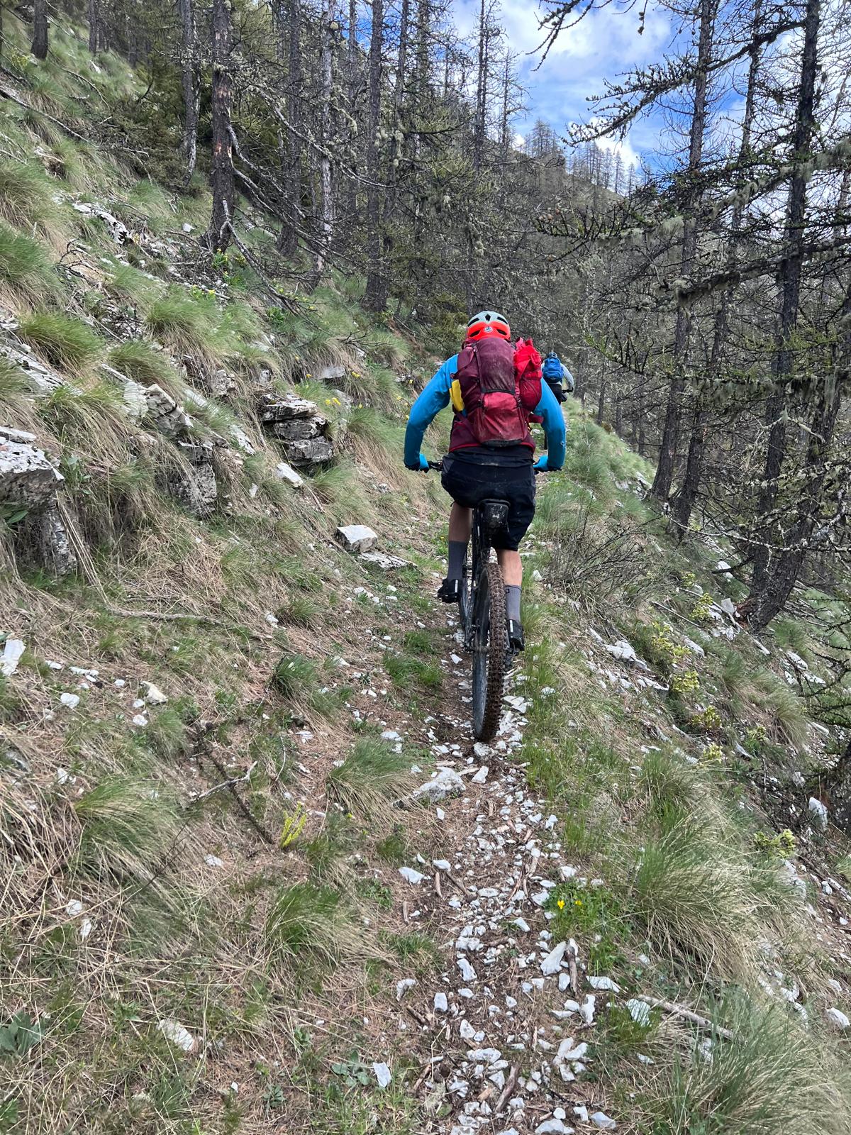 Ensuite une belle descente sur monotrace tantôt technique tantôt rapide nous conduit à Plan d’Asse. Un peu de route et nous voici sur un ancien sentier emprunté par l’armée Napoléonnienne. Une longue montée en monotrace bien cassante avec des racines, des raidars et d’anciennes marches en pierre. Epuisant ! La fatigue est bien là !